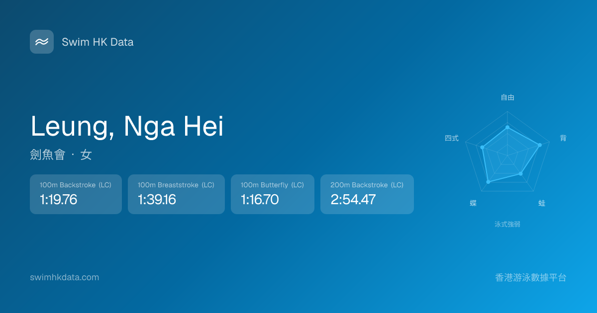 此圖表根據你所有比賽成績計算,顯示你在各泳式的相對強弱,僅供參考。繼續努力,每一次練習都會讓你更快更強!💪