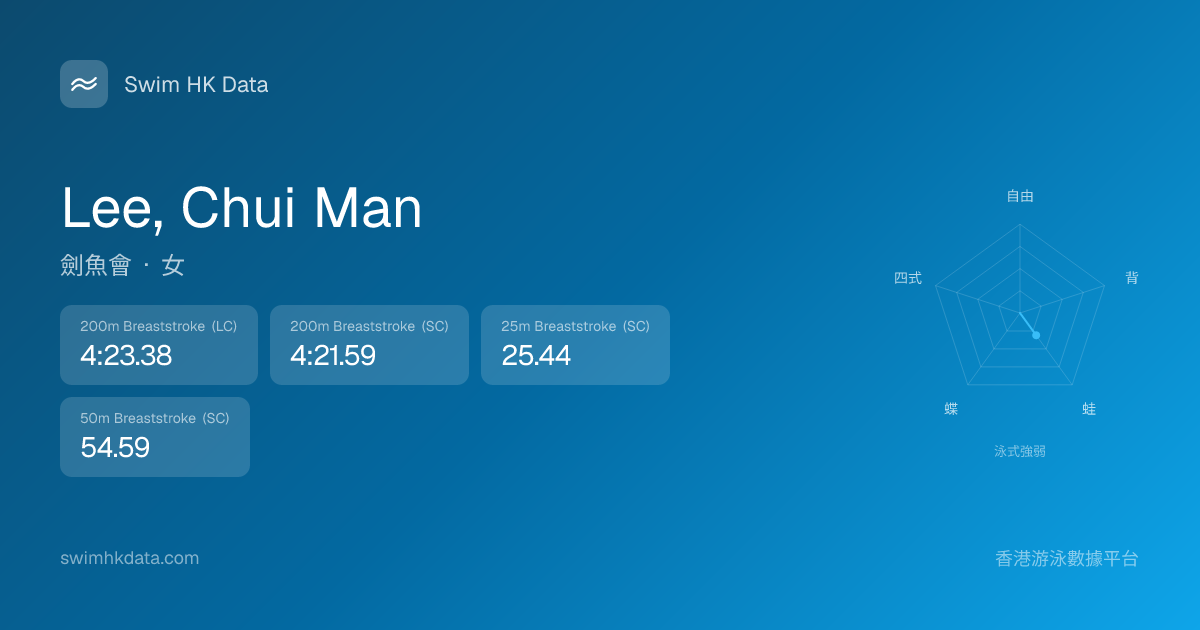 此圖表根據你所有比賽成績計算,顯示你在各泳式的相對強弱,僅供參考。繼續努力,每一次練習都會讓你更快更強!💪