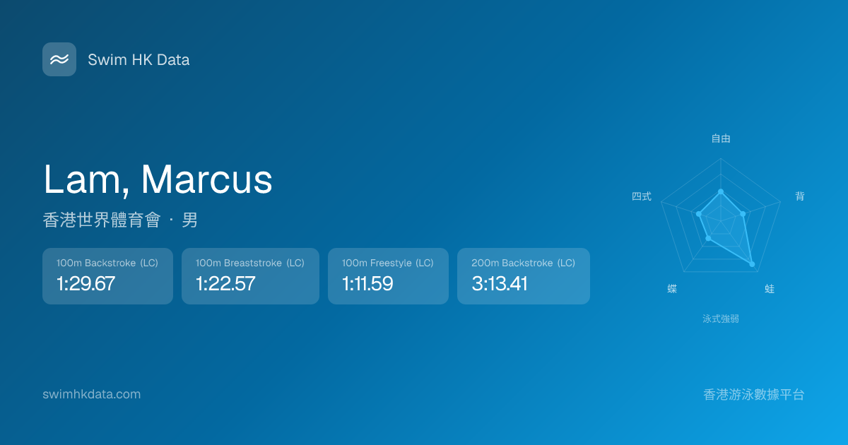 此圖表根據你所有比賽成績計算,顯示你在各泳式的相對強弱,僅供參考。繼續努力,每一次練習都會讓你更快更強!💪