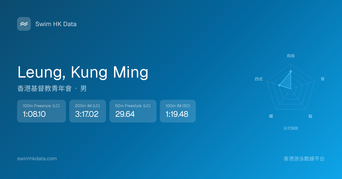 此圖表根據你所有比賽成績計算,顯示你在各泳式的相對強弱,僅供參考。繼續努力,每一次練習都會讓你更快更強!💪