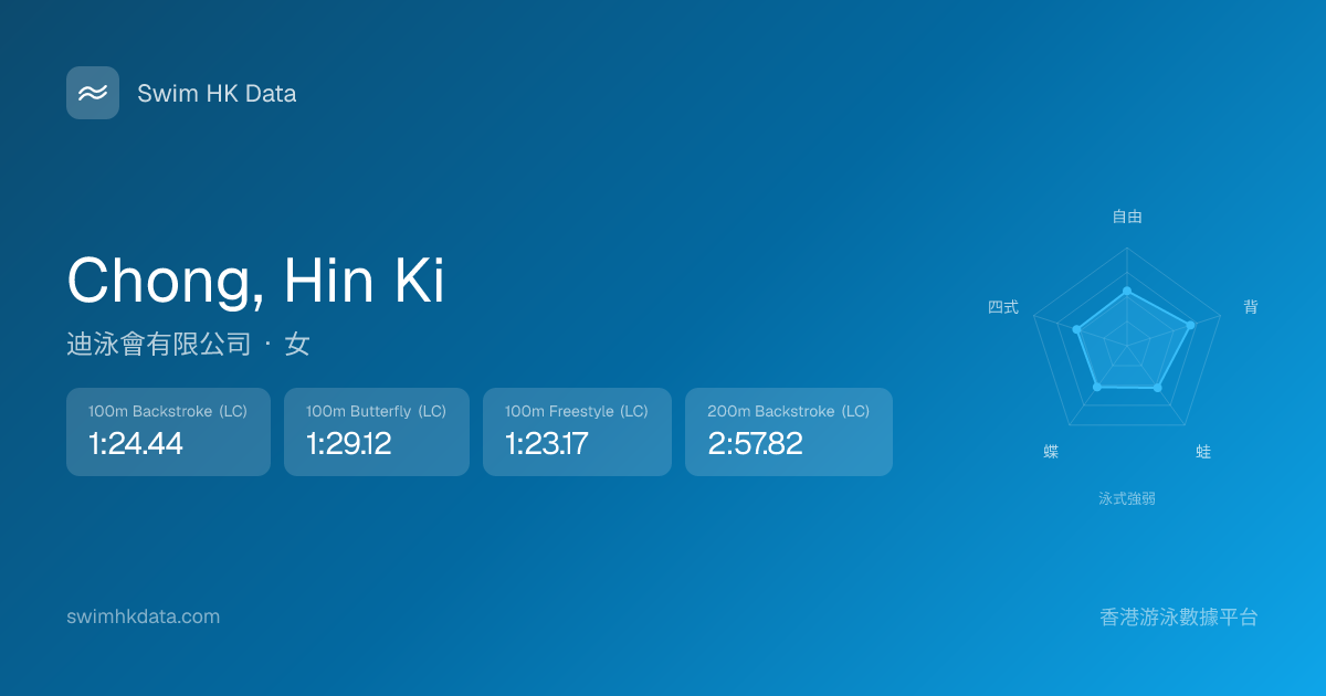 此圖表根據你所有比賽成績計算,顯示你在各泳式的相對強弱,僅供參考。繼續努力,每一次練習都會讓你更快更強!💪