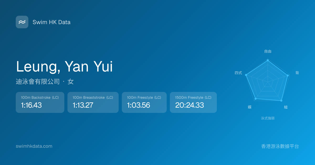 此圖表根據你所有比賽成績計算,顯示你在各泳式的相對強弱,僅供參考。繼續努力,每一次練習都會讓你更快更強!💪