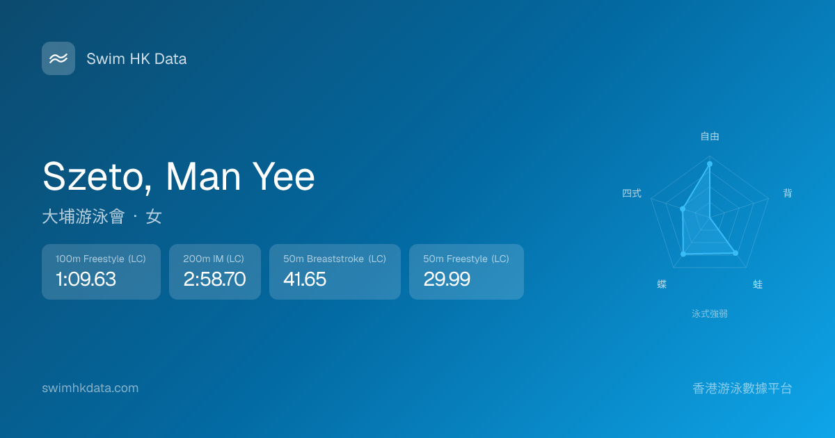 此圖表根據你所有比賽成績計算,顯示你在各泳式的相對強弱,僅供參考。繼續努力,每一次練習都會讓你更快更強!💪