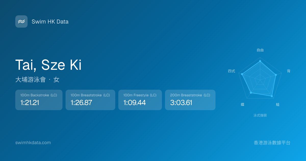 此圖表根據你所有比賽成績計算,顯示你在各泳式的相對強弱,僅供參考。繼續努力,每一次練習都會讓你更快更強!💪