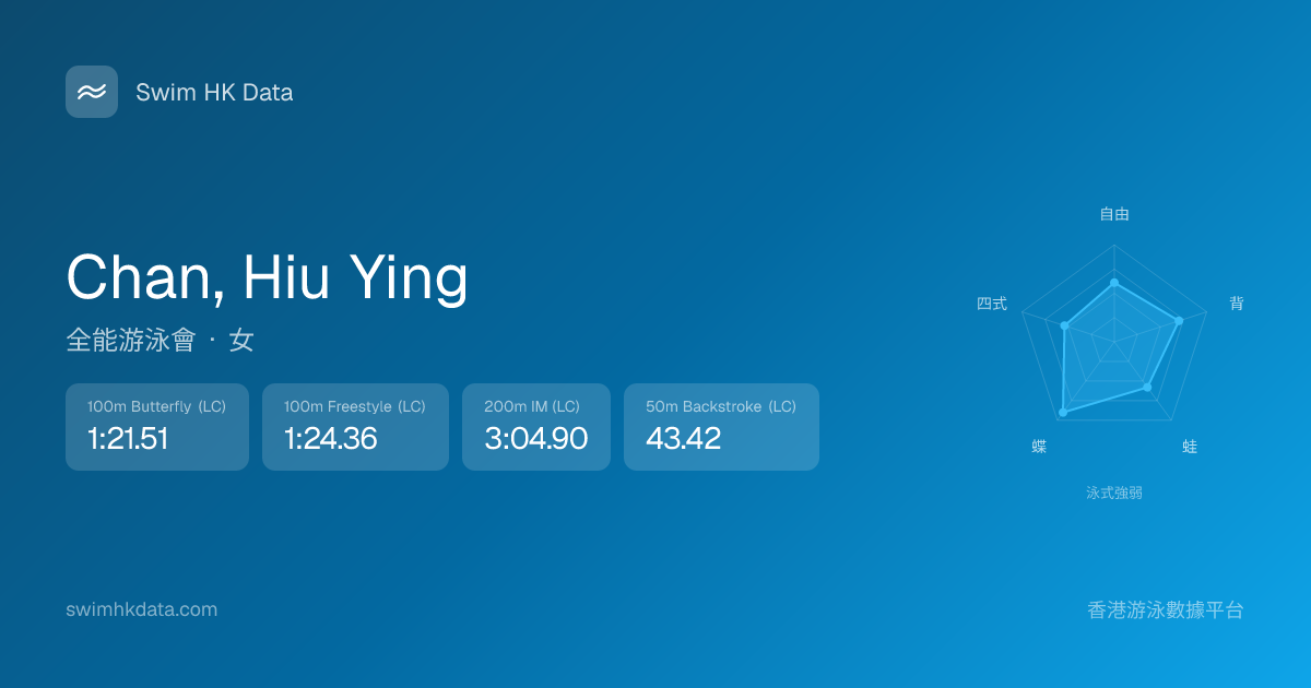 此圖表根據你所有比賽成績計算,顯示你在各泳式的相對強弱,僅供參考。繼續努力,每一次練習都會讓你更快更強!💪