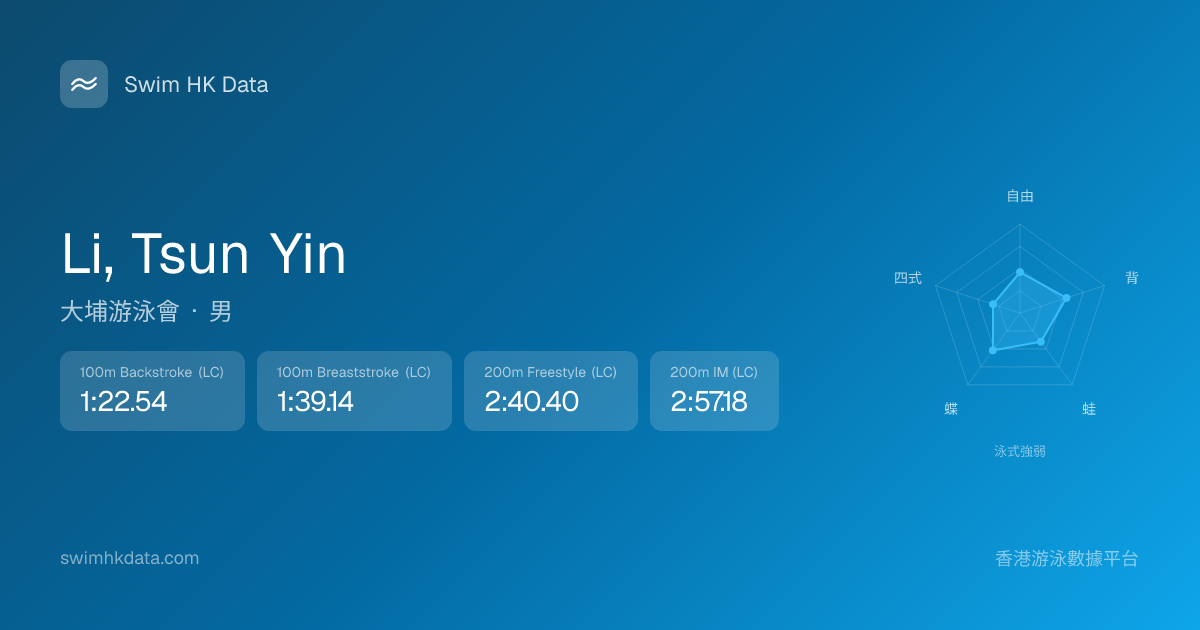 此圖表根據你所有比賽成績計算,顯示你在各泳式的相對強弱,僅供參考。繼續努力,每一次練習都會讓你更快更強!💪