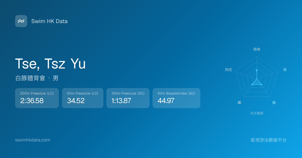 此圖表根據你所有比賽成績計算,顯示你在各泳式的相對強弱,僅供參考。繼續努力,每一次練習都會讓你更快更強!💪