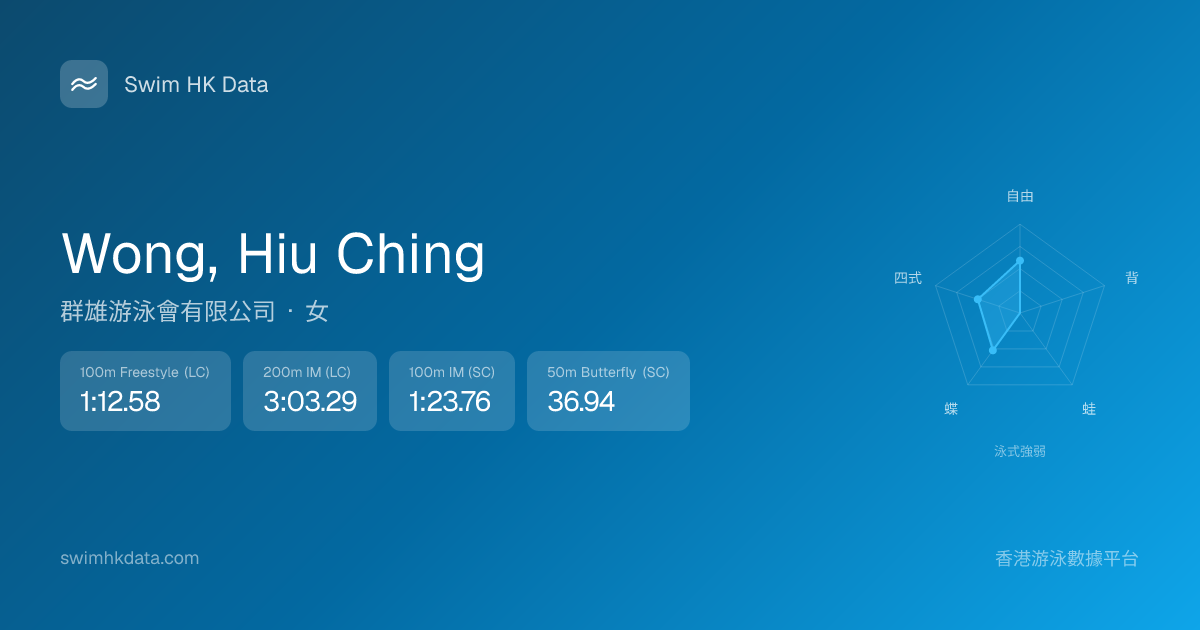 此圖表根據你所有比賽成績計算,顯示你在各泳式的相對強弱,僅供參考。繼續努力,每一次練習都會讓你更快更強!💪