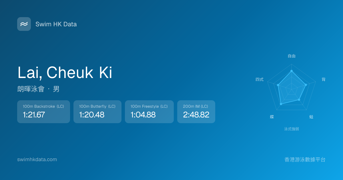 此圖表根據你所有比賽成績計算,顯示你在各泳式的相對強弱,僅供參考。繼續努力,每一次練習都會讓你更快更強!💪
