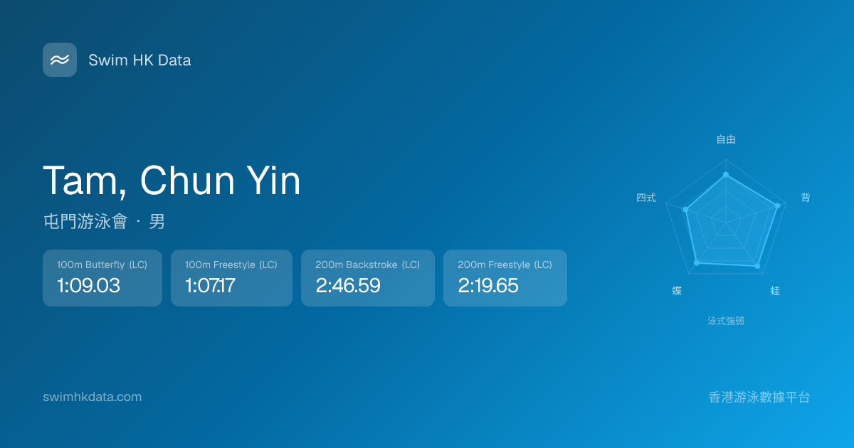 此圖表根據你所有比賽成績計算,顯示你在各泳式的相對強弱,僅供參考。繼續努力,每一次練習都會讓你更快更強!💪
