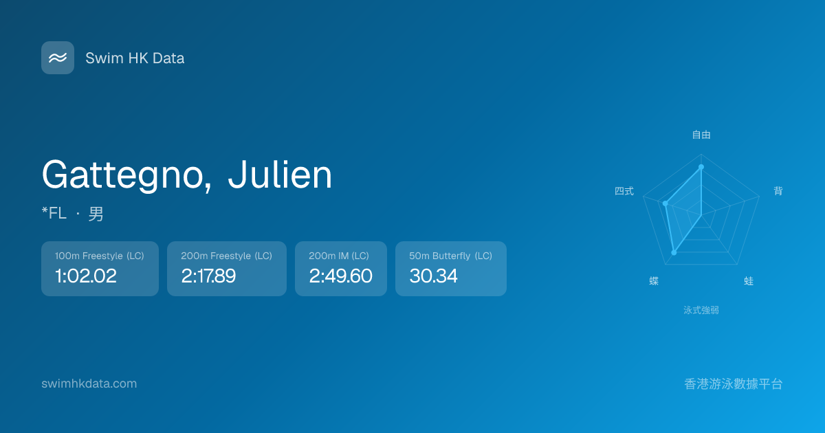 此圖表根據你所有比賽成績計算,顯示你在各泳式的相對強弱,僅供參考。繼續努力,每一次練習都會讓你更快更強!💪