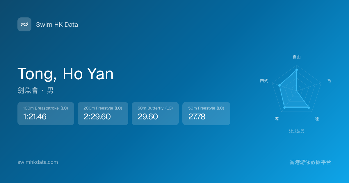 此圖表根據你所有比賽成績計算,顯示你在各泳式的相對強弱,僅供參考。繼續努力,每一次練習都會讓你更快更強!💪