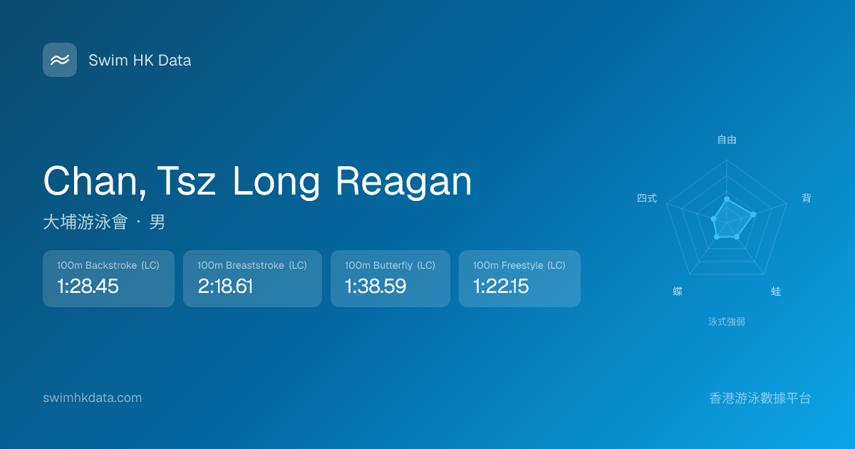 此圖表根據你所有比賽成績計算,顯示你在各泳式的相對強弱,僅供參考。繼續努力,每一次練習都會讓你更快更強!💪