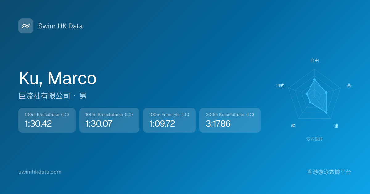 此圖表根據你所有比賽成績計算,顯示你在各泳式的相對強弱,僅供參考。繼續努力,每一次練習都會讓你更快更強!💪