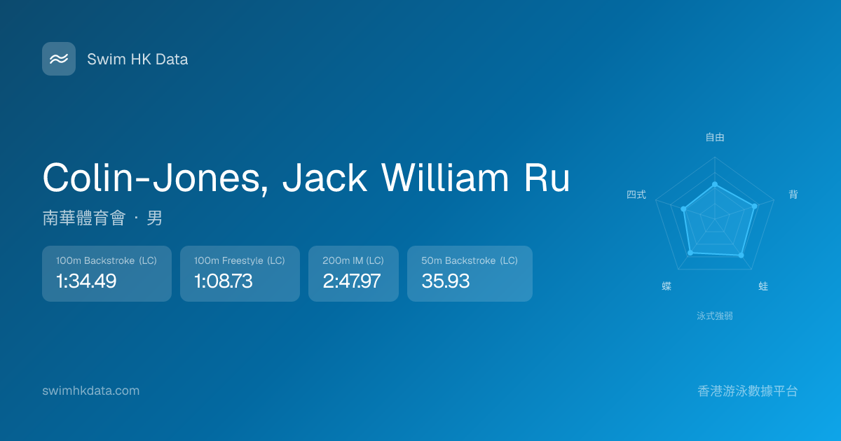 此圖表根據你所有比賽成績計算,顯示你在各泳式的相對強弱,僅供參考。繼續努力,每一次練習都會讓你更快更強!💪