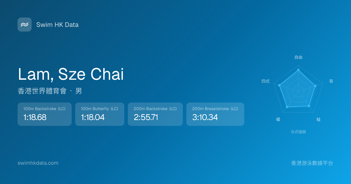 此圖表根據你所有比賽成績計算,顯示你在各泳式的相對強弱,僅供參考。繼續努力,每一次練習都會讓你更快更強!💪