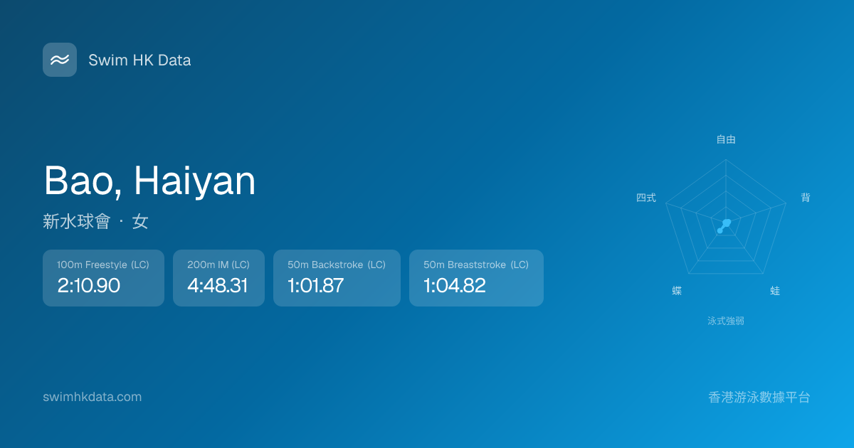 此圖表根據你所有比賽成績計算,顯示你在各泳式的相對強弱,僅供參考。繼續努力,每一次練習都會讓你更快更強!💪