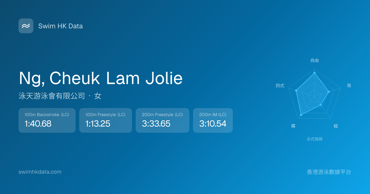 此圖表根據你所有比賽成績計算,顯示你在各泳式的相對強弱,僅供參考。繼續努力,每一次練習都會讓你更快更強!💪