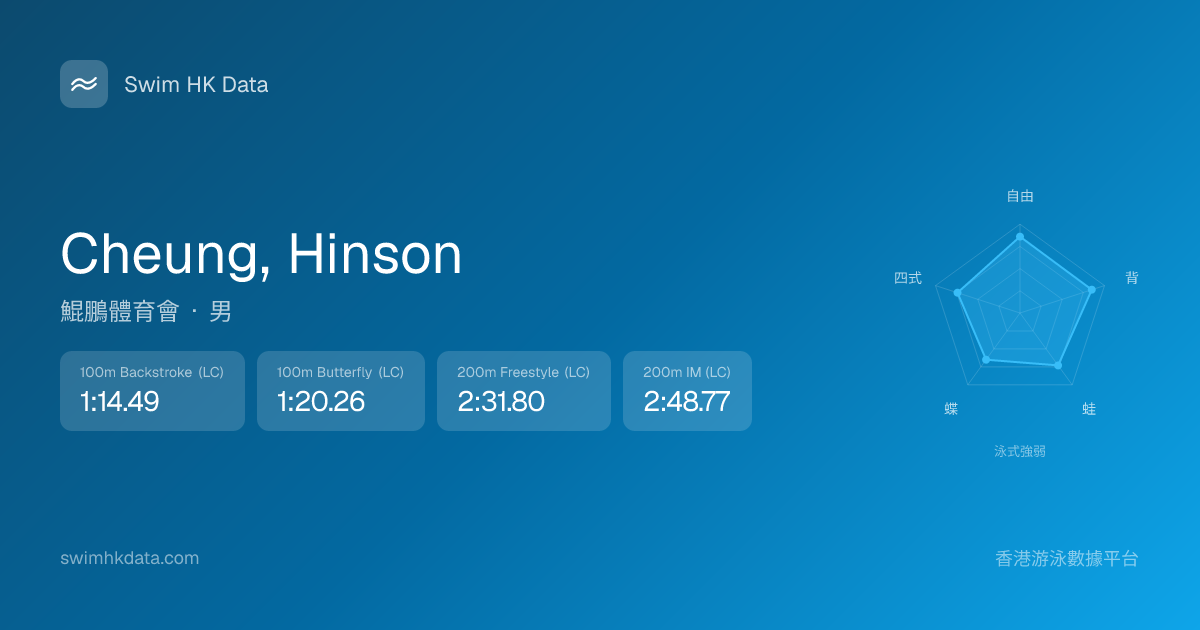 此圖表根據你所有比賽成績計算,顯示你在各泳式的相對強弱,僅供參考。繼續努力,每一次練習都會讓你更快更強!💪