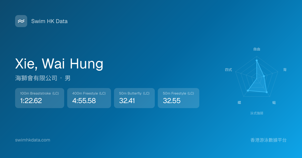 此圖表根據你所有比賽成績計算,顯示你在各泳式的相對強弱,僅供參考。繼續努力,每一次練習都會讓你更快更強!💪