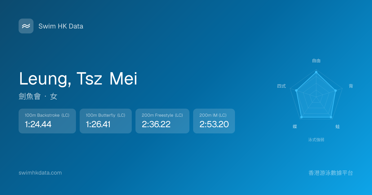 此圖表根據你所有比賽成績計算,顯示你在各泳式的相對強弱,僅供參考。繼續努力,每一次練習都會讓你更快更強!💪