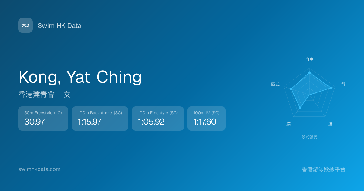 此圖表根據你所有比賽成績計算,顯示你在各泳式的相對強弱,僅供參考。繼續努力,每一次練習都會讓你更快更強!💪