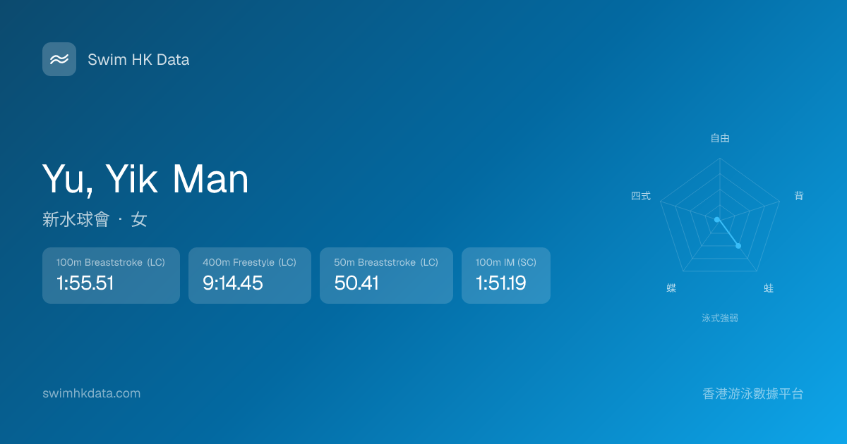 此圖表根據你所有比賽成績計算,顯示你在各泳式的相對強弱,僅供參考。繼續努力,每一次練習都會讓你更快更強!💪