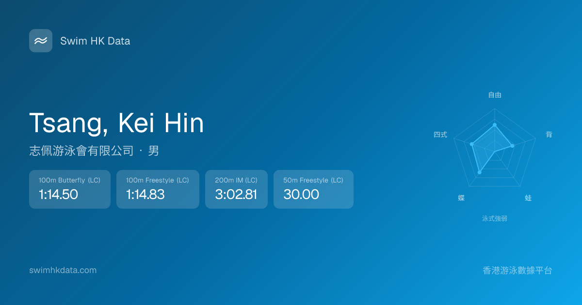 此圖表根據你所有比賽成績計算,顯示你在各泳式的相對強弱,僅供參考。繼續努力,每一次練習都會讓你更快更強!💪