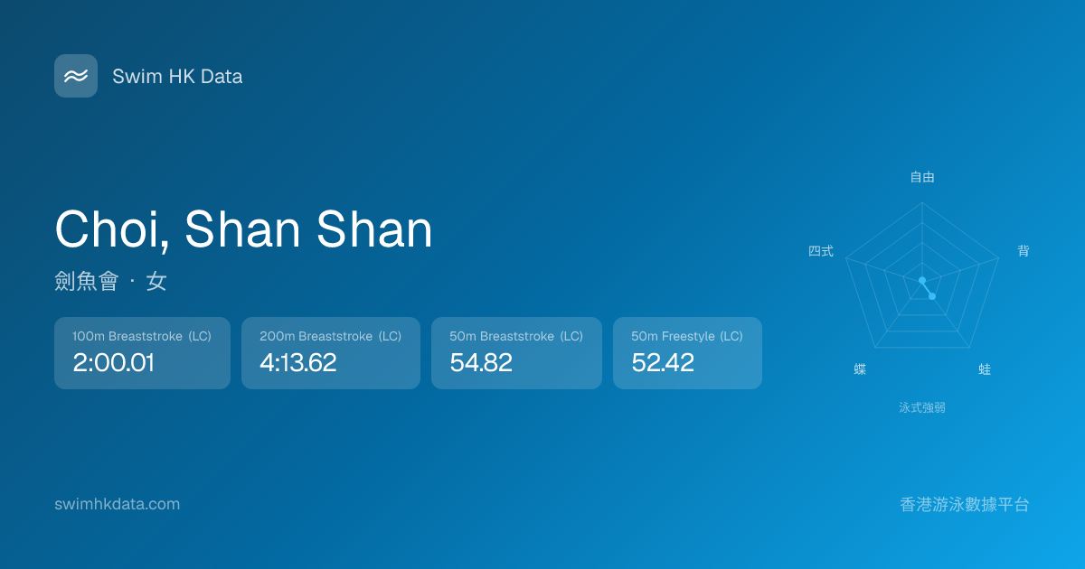 此圖表根據你所有比賽成績計算,顯示你在各泳式的相對強弱,僅供參考。繼續努力,每一次練習都會讓你更快更強!💪