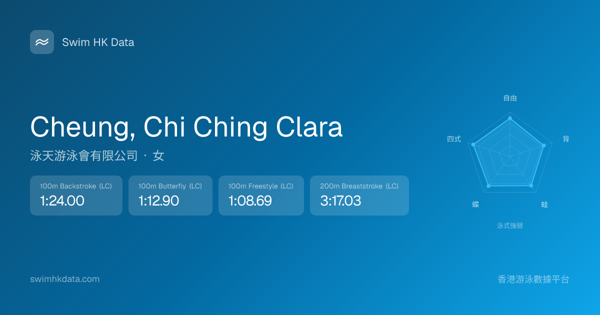 此圖表根據你所有比賽成績計算,顯示你在各泳式的相對強弱,僅供參考。繼續努力,每一次練習都會讓你更快更強!💪