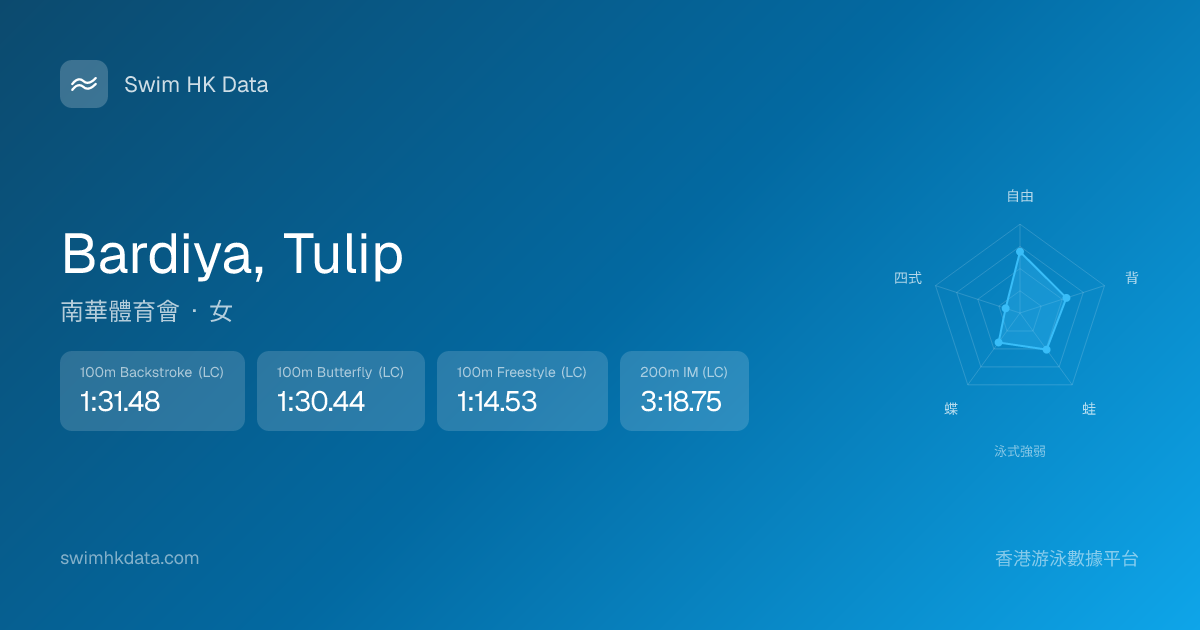 此圖表根據你所有比賽成績計算,顯示你在各泳式的相對強弱,僅供參考。繼續努力,每一次練習都會讓你更快更強!💪