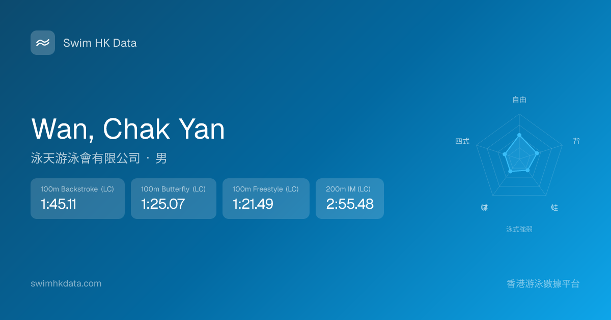 此圖表根據你所有比賽成績計算,顯示你在各泳式的相對強弱,僅供參考。繼續努力,每一次練習都會讓你更快更強!💪