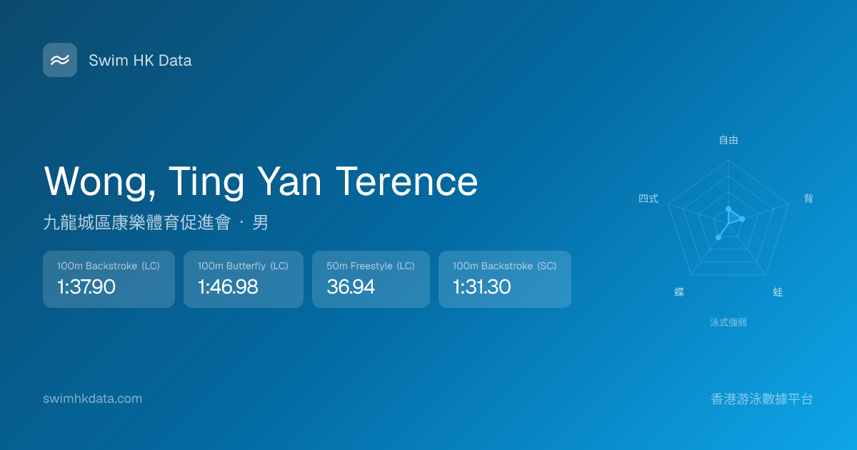 此圖表根據你所有比賽成績計算,顯示你在各泳式的相對強弱,僅供參考。繼續努力,每一次練習都會讓你更快更強!💪