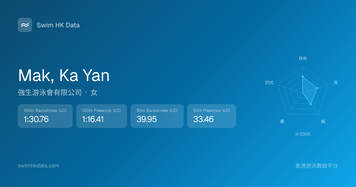 此圖表根據你所有比賽成績計算,顯示你在各泳式的相對強弱,僅供參考。繼續努力,每一次練習都會讓你更快更強!💪