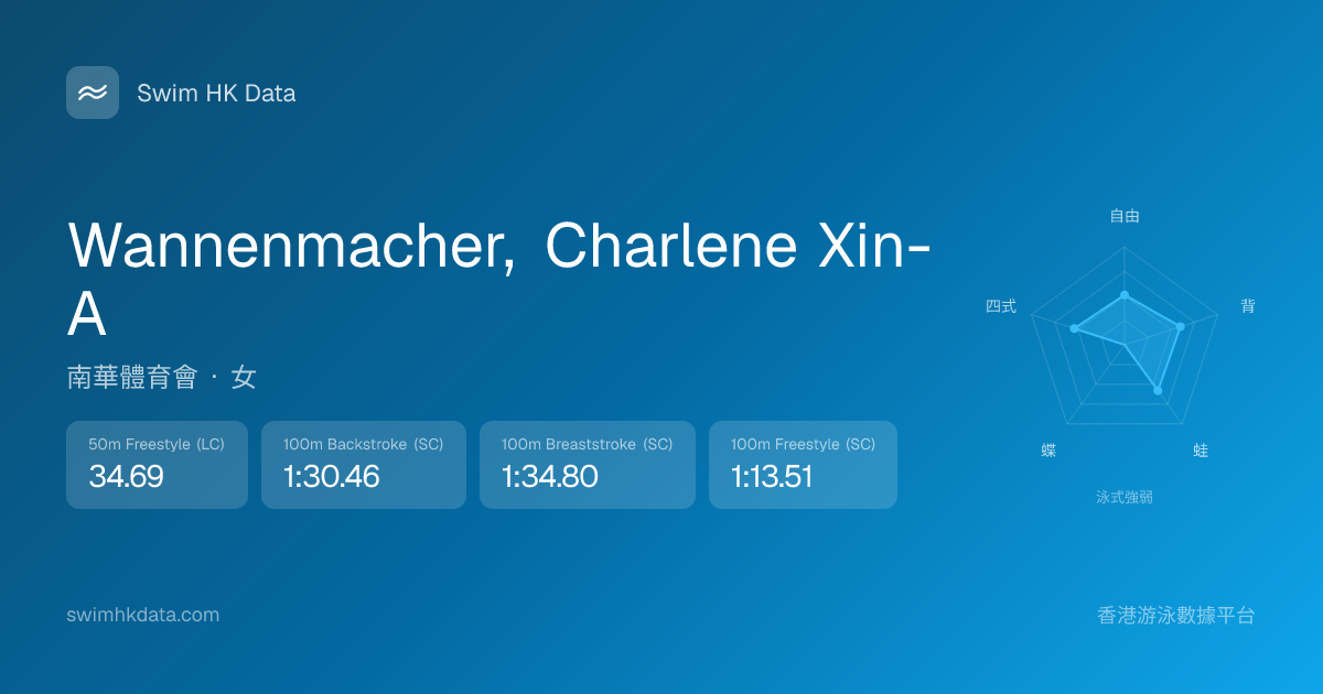 此圖表根據你所有比賽成績計算,顯示你在各泳式的相對強弱,僅供參考。繼續努力,每一次練習都會讓你更快更強!💪