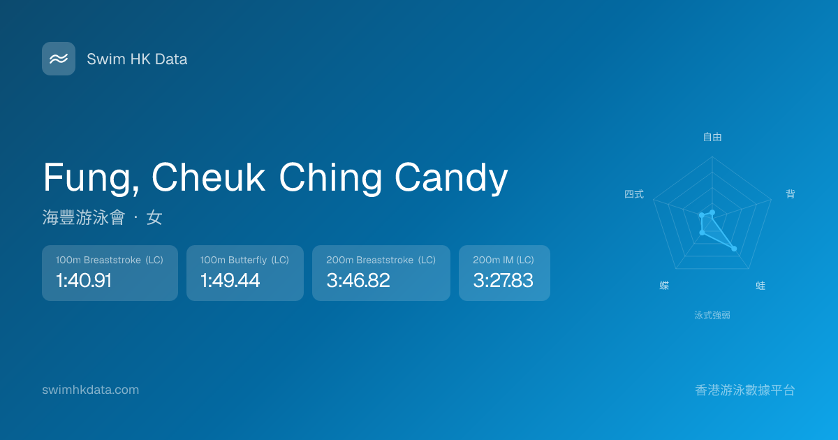 此圖表根據你所有比賽成績計算,顯示你在各泳式的相對強弱,僅供參考。繼續努力,每一次練習都會讓你更快更強!💪