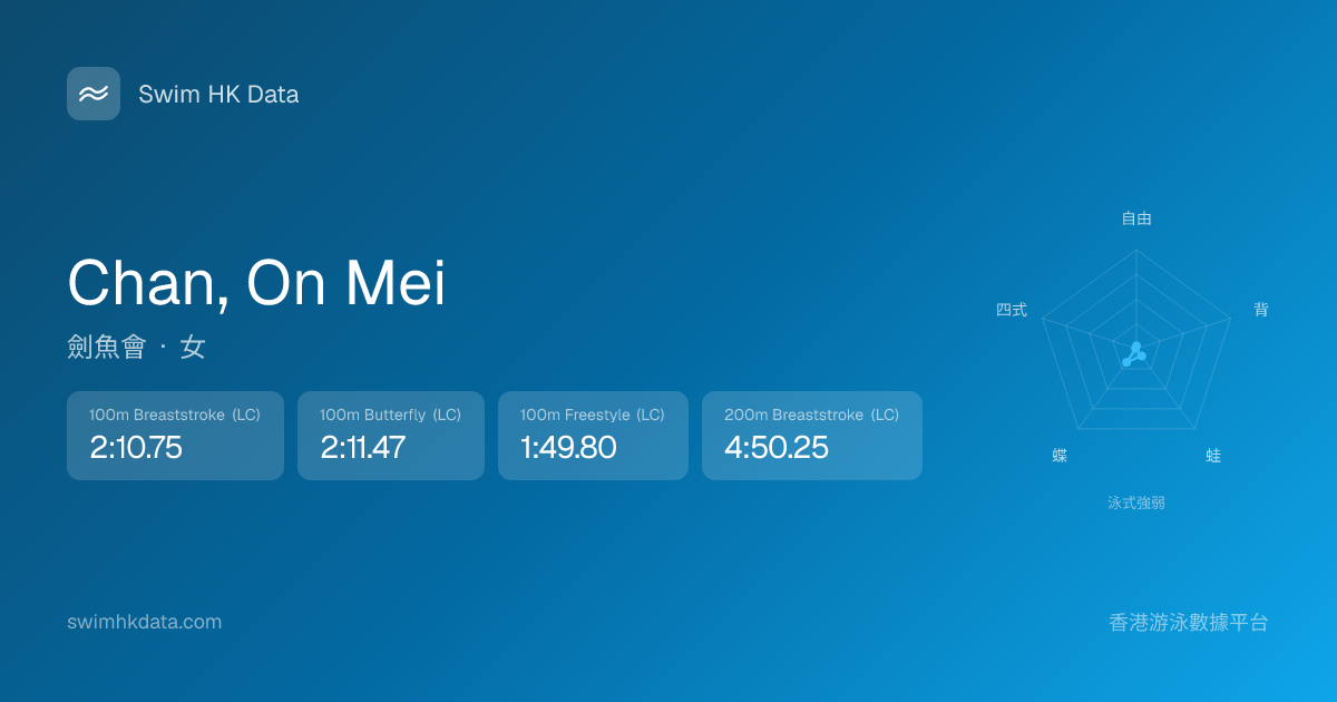 此圖表根據你所有比賽成績計算,顯示你在各泳式的相對強弱,僅供參考。繼續努力,每一次練習都會讓你更快更強!💪