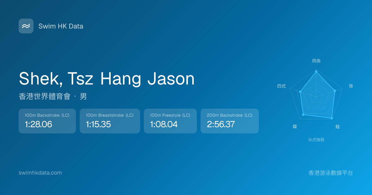 此圖表根據你所有比賽成績計算,顯示你在各泳式的相對強弱,僅供參考。繼續努力,每一次練習都會讓你更快更強!💪
