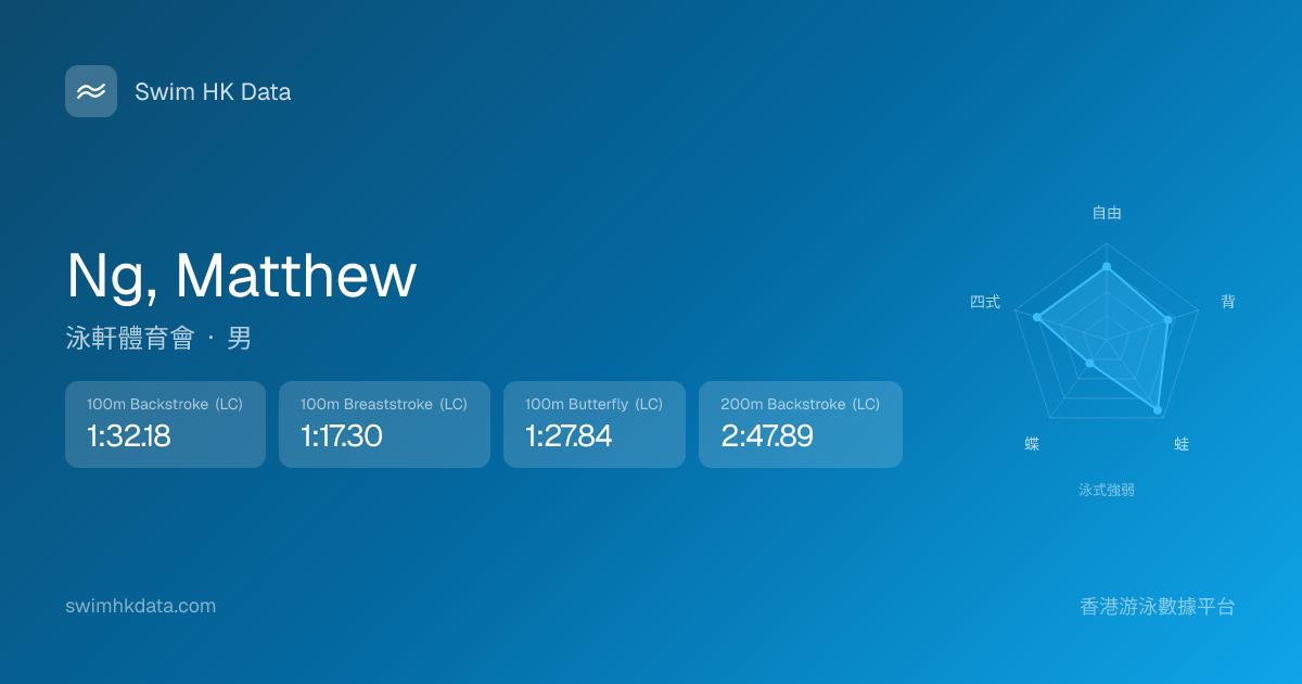 此圖表根據你所有比賽成績計算,顯示你在各泳式的相對強弱,僅供參考。繼續努力,每一次練習都會讓你更快更強!💪