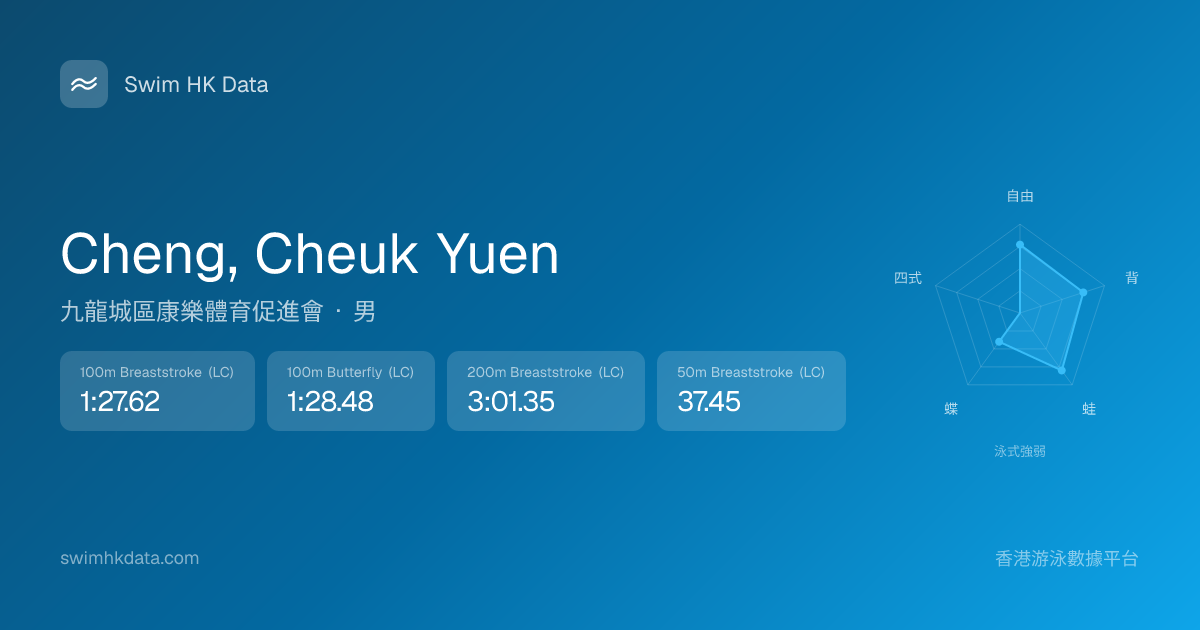 此圖表根據你所有比賽成績計算,顯示你在各泳式的相對強弱,僅供參考。繼續努力,每一次練習都會讓你更快更強!💪