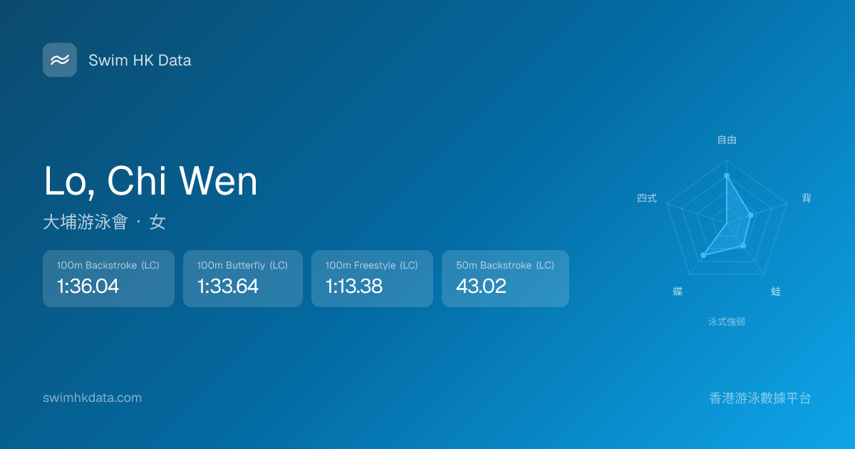此圖表根據你所有比賽成績計算,顯示你在各泳式的相對強弱,僅供參考。繼續努力,每一次練習都會讓你更快更強!💪