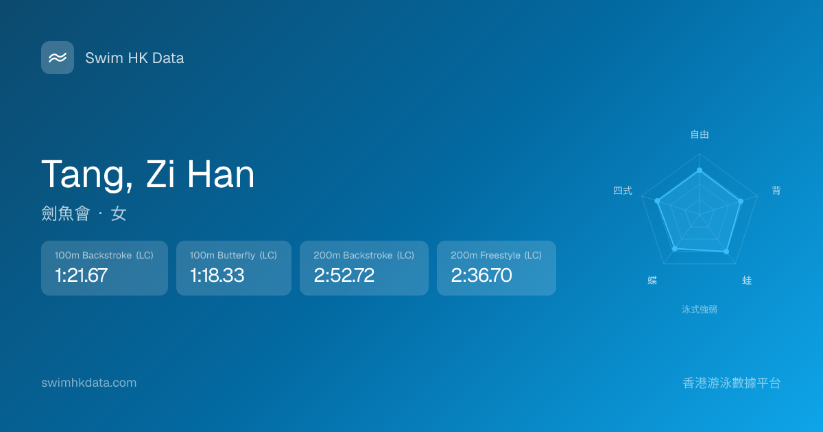 此圖表根據你所有比賽成績計算,顯示你在各泳式的相對強弱,僅供參考。繼續努力,每一次練習都會讓你更快更強!💪