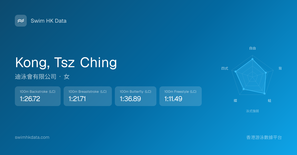 此圖表根據你所有比賽成績計算,顯示你在各泳式的相對強弱,僅供參考。繼續努力,每一次練習都會讓你更快更強!💪