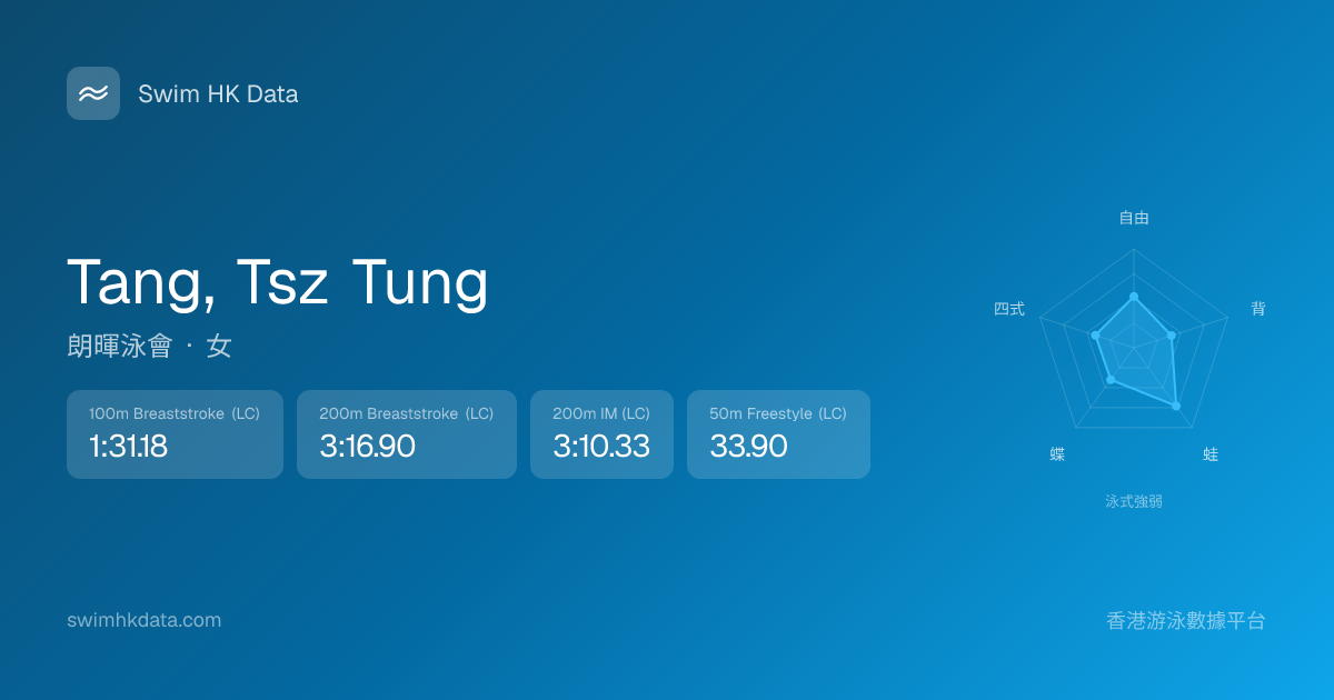 此圖表根據你所有比賽成績計算,顯示你在各泳式的相對強弱,僅供參考。繼續努力,每一次練習都會讓你更快更強!💪