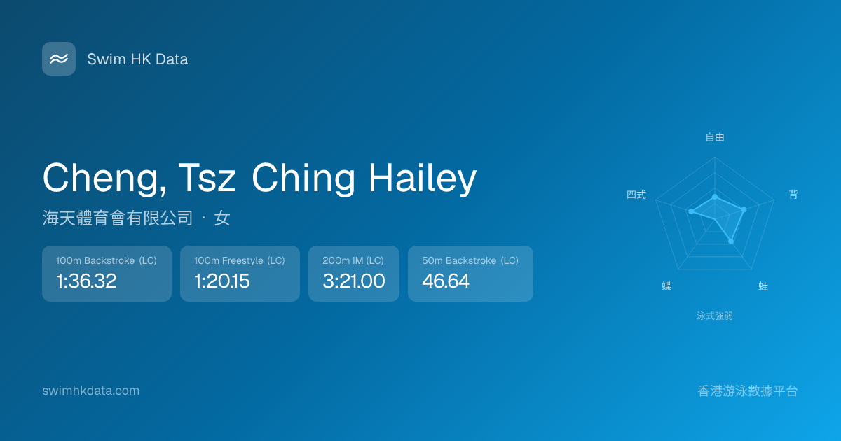 此圖表根據你所有比賽成績計算,顯示你在各泳式的相對強弱,僅供參考。繼續努力,每一次練習都會讓你更快更強!💪