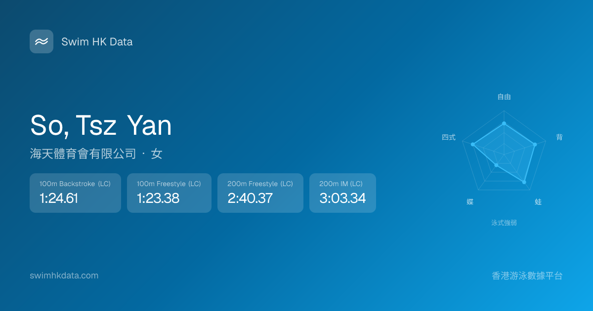 此圖表根據你所有比賽成績計算,顯示你在各泳式的相對強弱,僅供參考。繼續努力,每一次練習都會讓你更快更強!💪