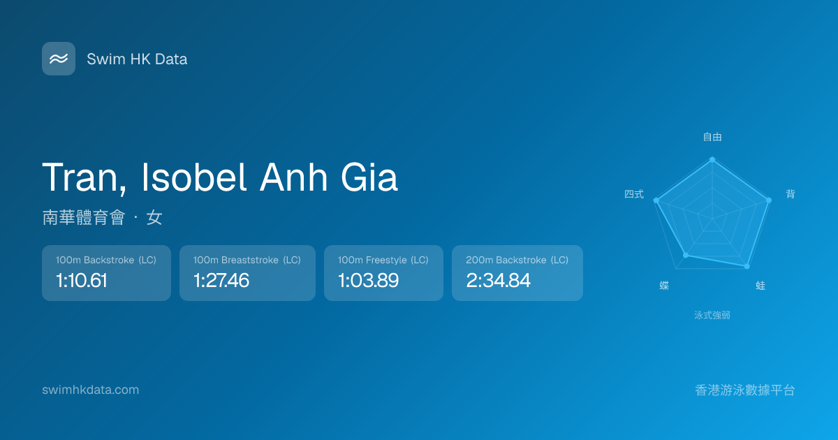 此圖表根據你所有比賽成績計算,顯示你在各泳式的相對強弱,僅供參考。繼續努力,每一次練習都會讓你更快更強!💪