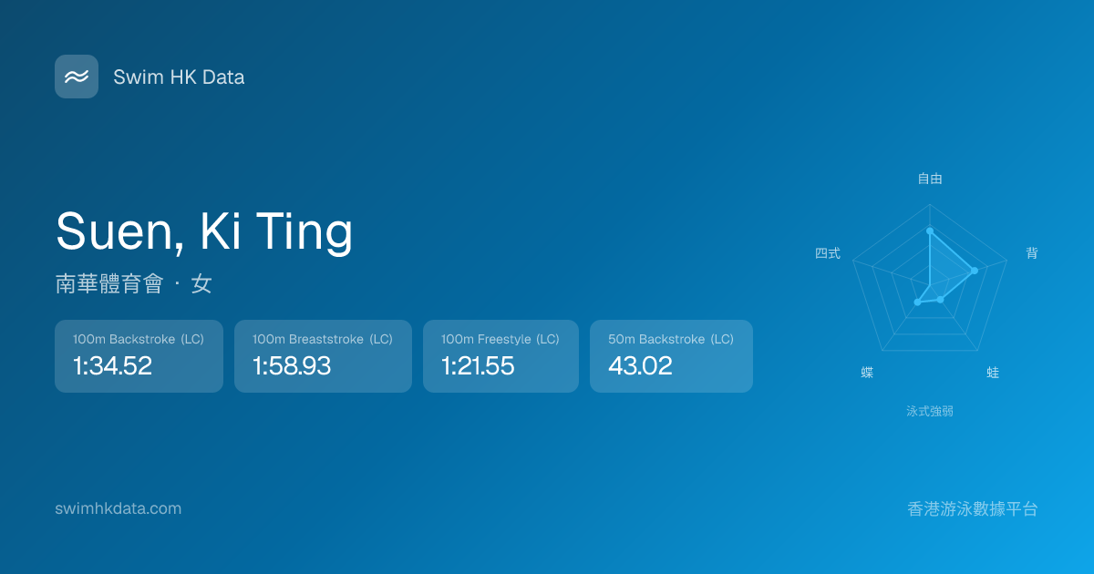 此圖表根據你所有比賽成績計算,顯示你在各泳式的相對強弱,僅供參考。繼續努力,每一次練習都會讓你更快更強!💪