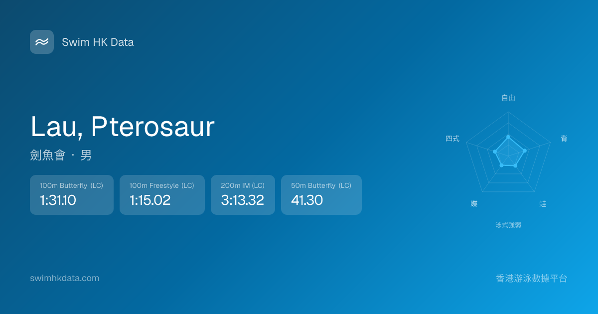 此圖表根據你所有比賽成績計算,顯示你在各泳式的相對強弱,僅供參考。繼續努力,每一次練習都會讓你更快更強!💪