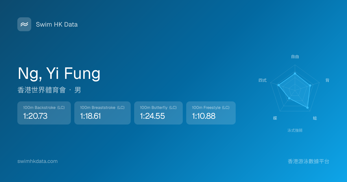 此圖表根據你所有比賽成績計算,顯示你在各泳式的相對強弱,僅供參考。繼續努力,每一次練習都會讓你更快更強!💪